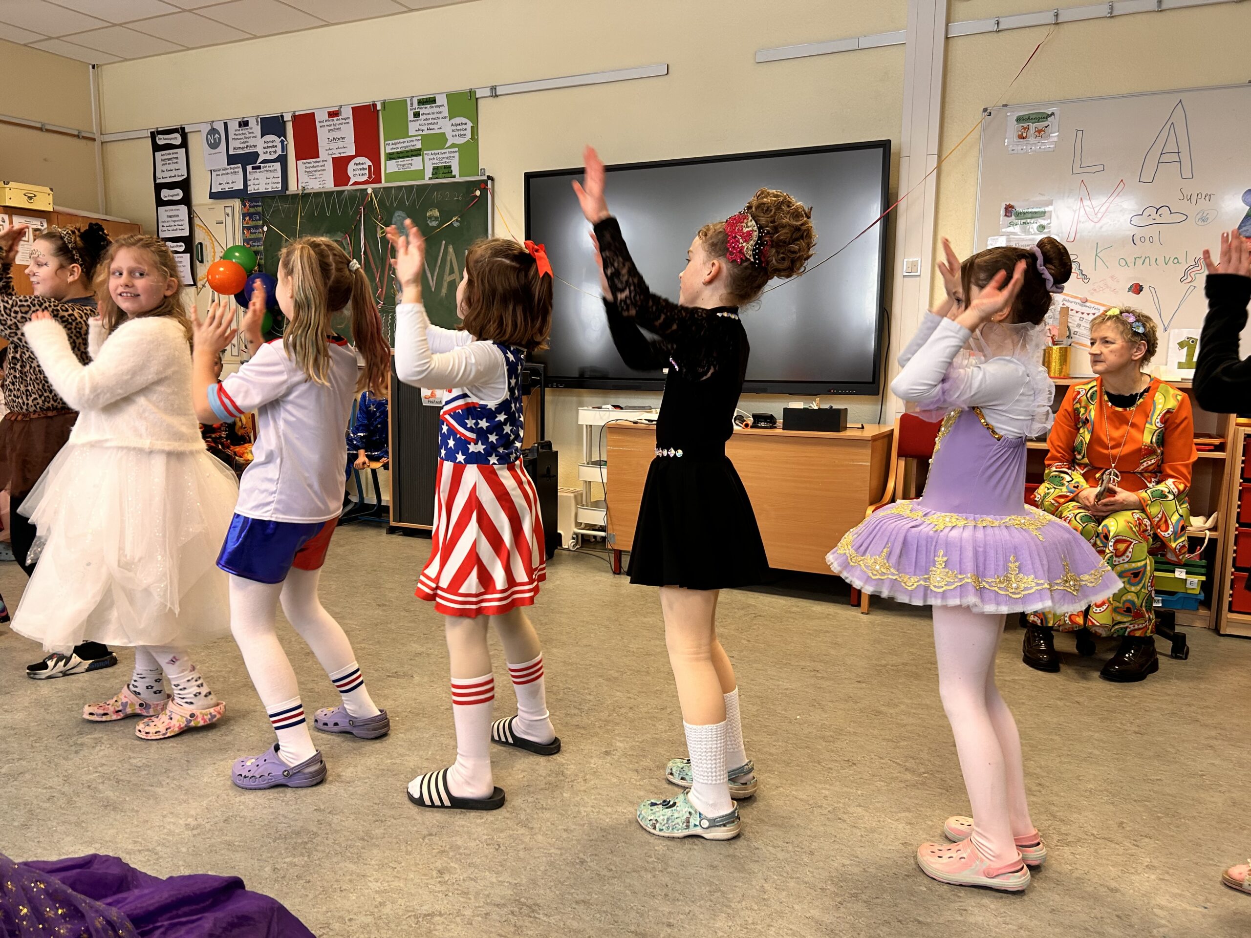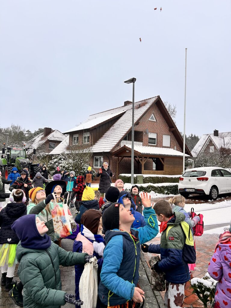 Wie in jedem Jahr feierte die Grundschule Fresenburg am Rosenmontag mit Liedern, Tänzen und einem leckeren, gesunden Frühstück. Auch die traditionelle Fahrt durch das Dorf durfte nicht fehlen. Trotz Schneematsch und Regen wurden die Kinder von vielen Eltern und Großeltern am Straßenrand begrüßt und mit Süßigkeiten beschenkt. Vielen Dank an Gerd Führs und Hermann Kampker für die Fahrt mit den Partywagen!