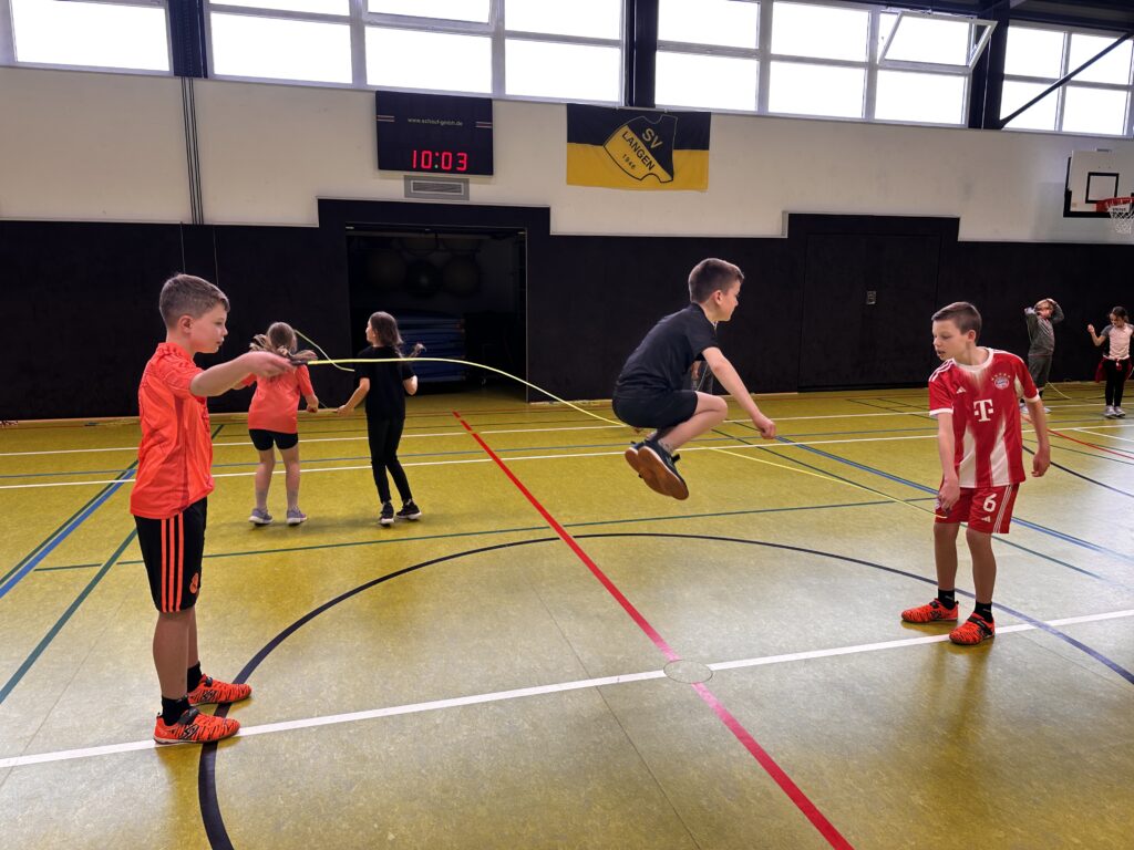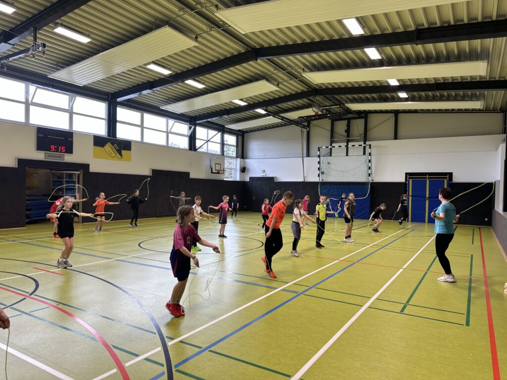 Vor den Osterferien nahmen die Schülerinnen und Schüler der Klassen 3 und 4 am Präventionsprojekt „Skipping Hearts“ teil. Ziel des Projekts der Deutschen Herzstiftung ist es, die Kinder zu mehr Bewegung zu motivieren. Denn wer bereits von Kind an einen gesunden Lebensstil pflegt, verringert das Risiko im Alter am Herzen zu erkranken. Die Kinder lernten einfache Sprünge aber auch solche, die man zu zweit durchführen kann und hatten viel Spaß an diesem bewegungsreichen Vormittag. Die Kinder der Klassen 1 und 2 sowie einige Eltern kamen zu Besuch, um die neu erlernten Sprünge und Kunststücke der Großen zu bewundern und selbst ein paar Probesprünge zu wagen.
